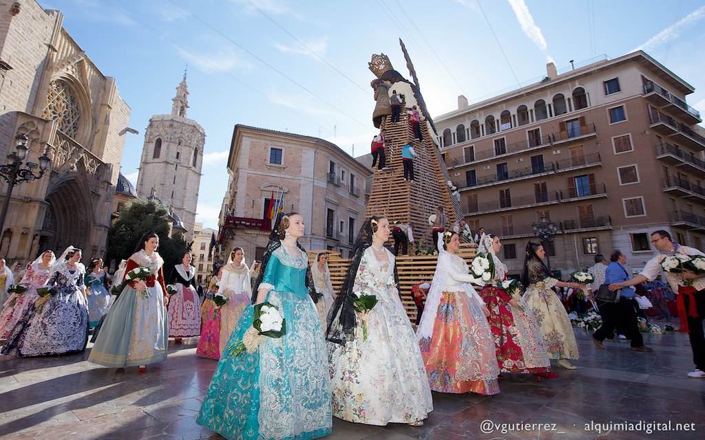 Los días 17 y 18 de marzo, miles de falleras desfilan por las calles de Valencia hacia la Plaza de la Virgen para entregar flores a la Virgen de los Desamparados. Con ellas, se forma un impresionante tapiz floral en el manto de la imagen gigante de la patrona de Valencia. Este evento es uno de los más emotivos de las Fallas, con cada comisión fallera desfilando con trajes tradicionales mientras ofrecen sus ramos. La imagen de la Virgen, una gran estructura de madera, cambia su aspecto cada año según el diseño que los organizadores elijan para su manto floral.